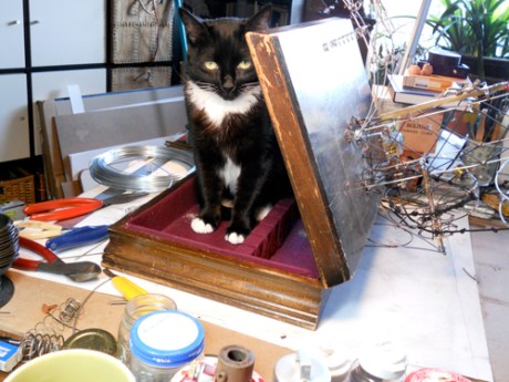 Bags, baskets, even old silverware boxes converted into art: she loves to be in things.
