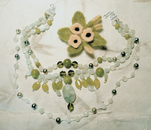 New three-strand necklace and felted wool pin; © 2011 Firehorse Designs