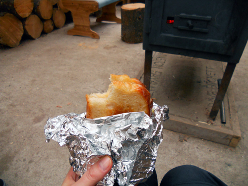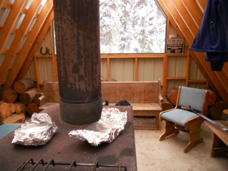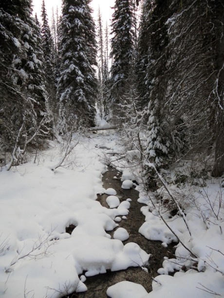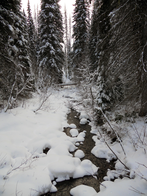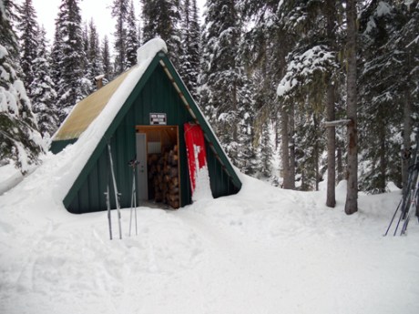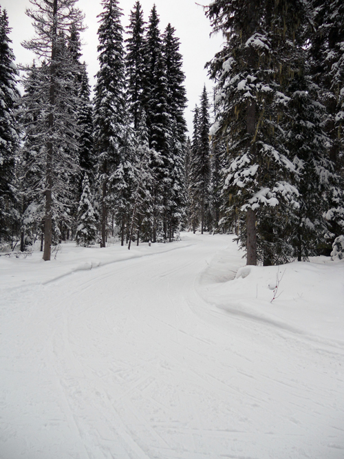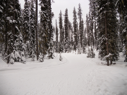 26 December 2011 What a magic day of skiing! A new local for me, the Castlegar Nordic Ski Club. Sis and I did the 8km beginner trail with a midway stop at a hut for more marvellous grilled cheese sandwiches. The sky was clear for the 4km to the hut; small birds could be heard in the tree tops. That first leg, Booty’s Trail, had lots of small dips and climbs. The hut was warm and cozy. When we emerged after our delicious lunch, the sky had changed dramatically. We began the second loop, Ben Shaw Trail, just as a few delicate snow flakes began to fall. Home for Christmas dinner leftovers. Perfect day!