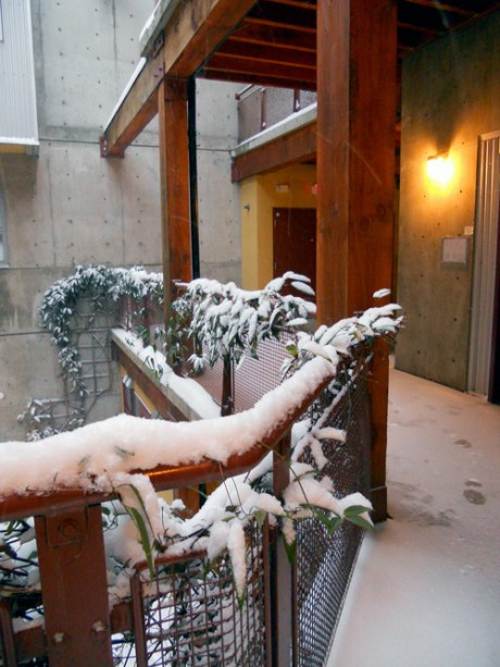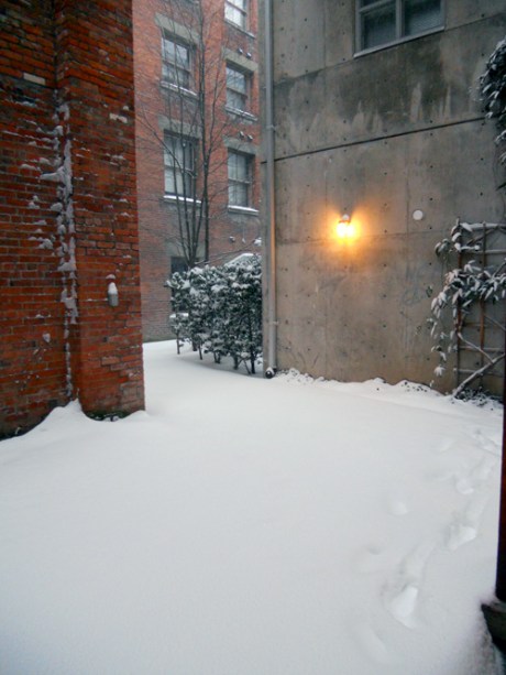 Apologies friends for my snow enthusiasm, especially those of you who live in snowy parts of the world and either take the cold snowy winter in stride or curse it daily. We rarely get any snow. A large number of the people who are not from here but move here would include “mild climate” among their reasons to live in Victoria. I just love the snow. Not just the beauty of it, but how (here anyway) it forces us to just slow down a bit. I’m sorry that it infringes on retail revenue, and sadly can cause terror and injury on the road. But since we have it hardly ever, I’m going to revel in it for as long as it sticks around! A couple pics from the back of our building this morning before it had been too disturbed.