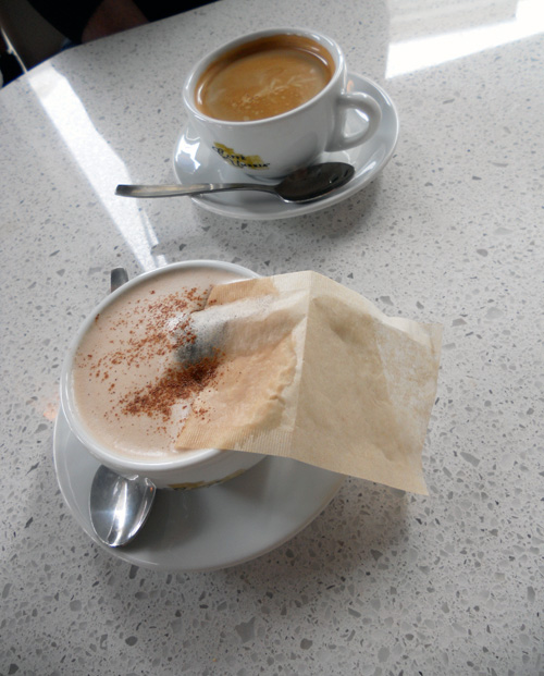 Walking around the downtown on a lovely spring day completing errands. Hey! Let’s stop for coffee! So we went to the new location of Macchiato Caffe and Paninoteca at The Juliet on the corner of Johnson and Blanshard streets. GJ’s americano was very good and I tried their Callebaut Spiced Chocolate Chai which was amazing! It looks like they have nice sandwiches and treats too.