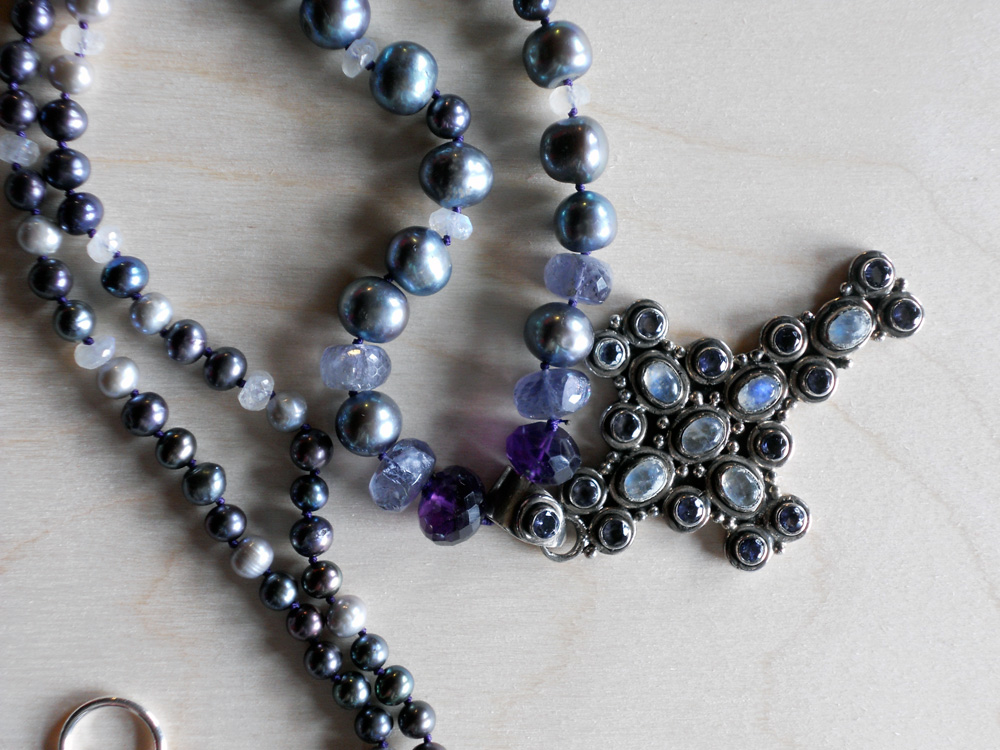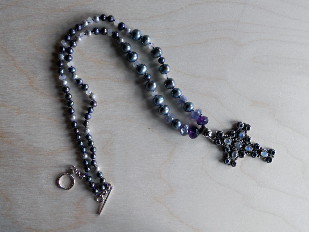 Dark blue-purple pearls of various sizes, moonstones, amethyst and iolite beads and a reclaimed silver cross pendant.