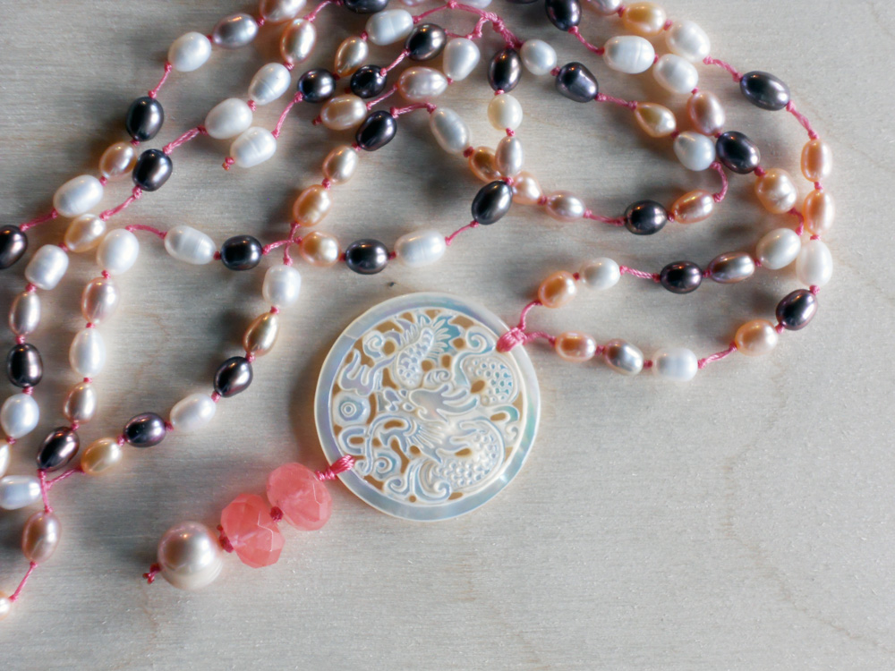Pink, peach, white and purple/grey freshwater pearls with a mother-of-pearl dragon pendant and an accent of cherry quartz.