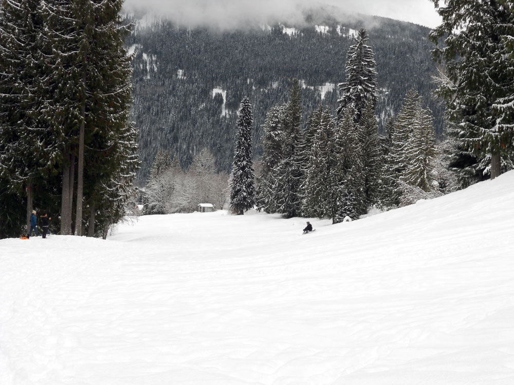 Looking back to where we would eventually end up. There were two very long, very fast runs. This little person in the distance was just about the half way mark speeding down the run!
