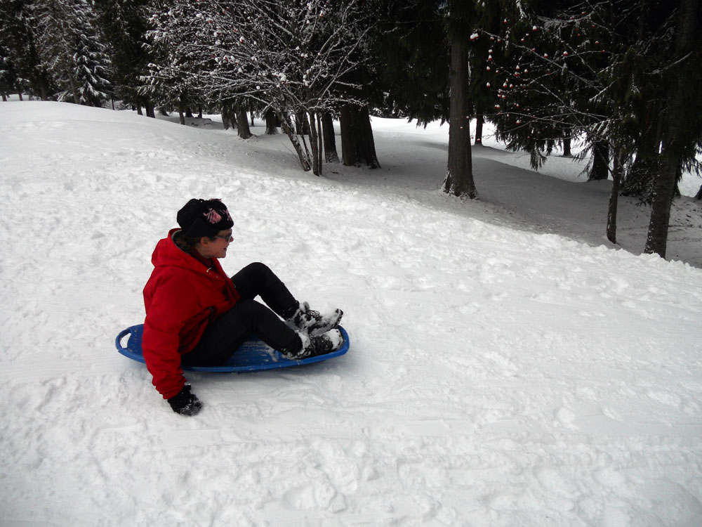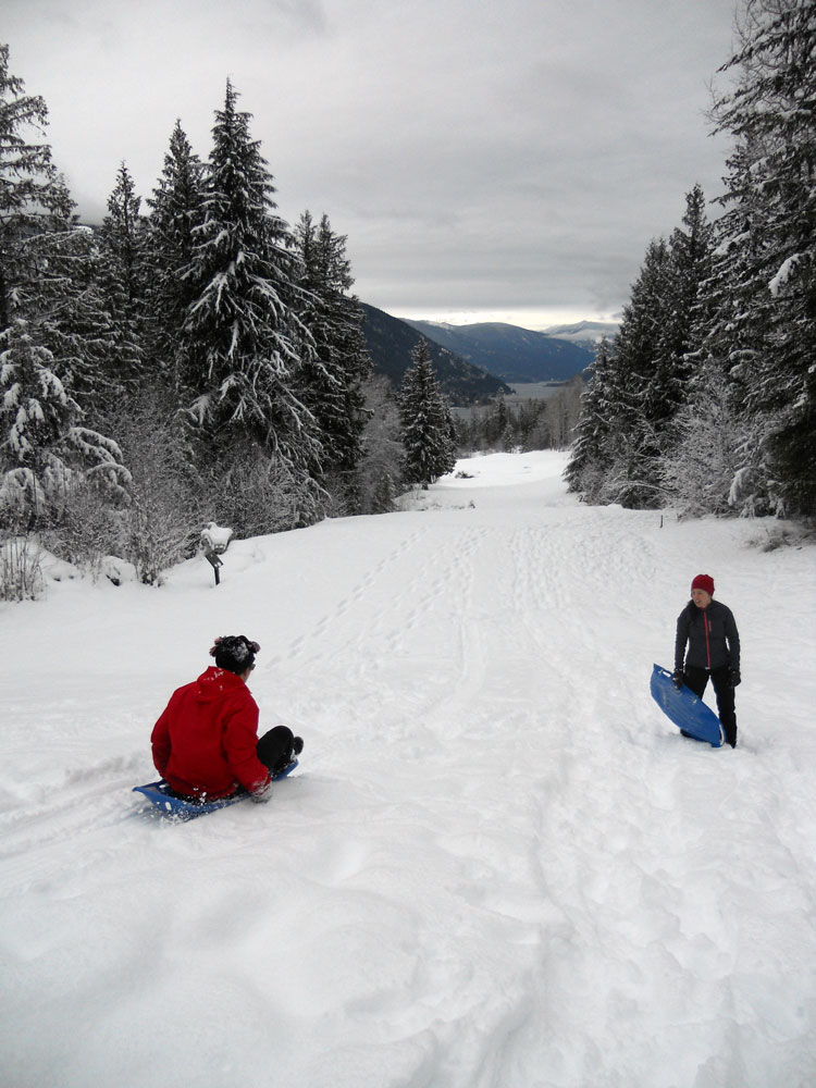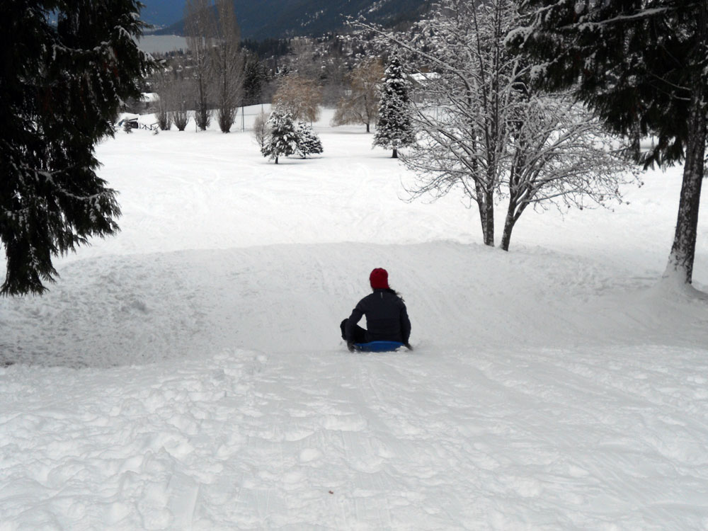 After breakfast, GJ, my sis and I waddled across the street to the golf course with snow shoes and toboggans in tow for a bit of fun and exercise. It was awesome fun!