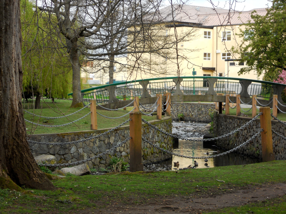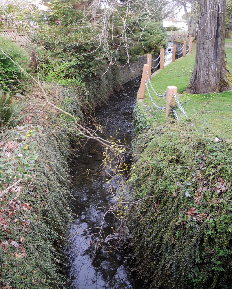 This park holds only a small portion of Bowker Creek, much of which is now covered by roadways.