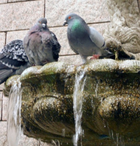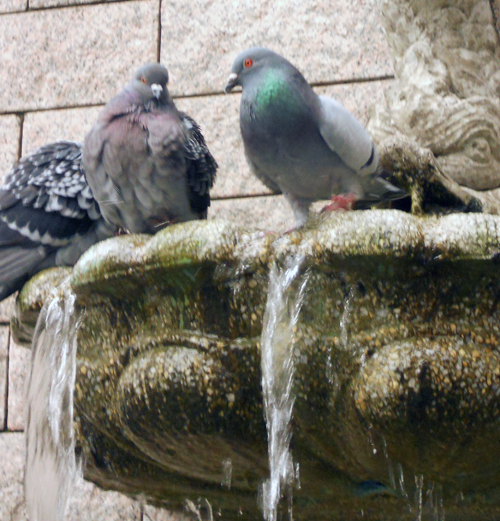 Too cold and wet for TC today, she needed her scarf. But not far away, some pigeon pals were bathing and frolicking in a local fountain.