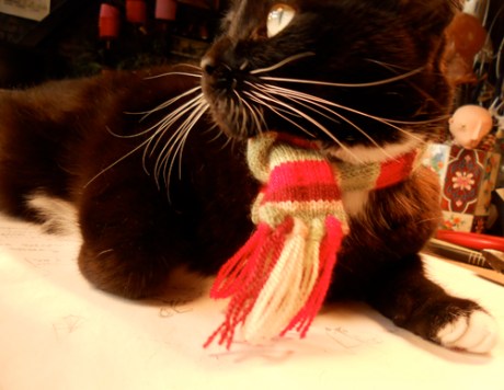 GJ took this shot a while ago. TC wearing our dearly departed friend Domino’s bow tie and collar. You can tell how she feels about it: