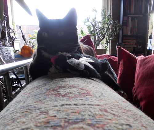 TC loves her new toy, lovingly made by our friend Annie. It’s full of nip.