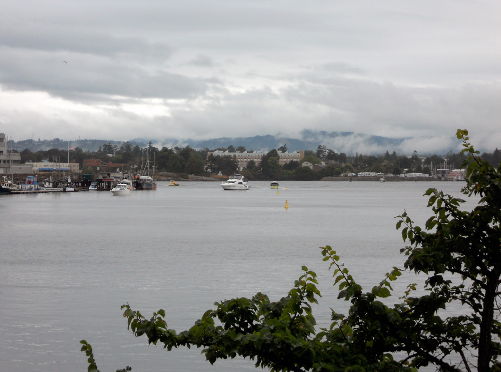 Looking out toward the entrance to the Inner Harbour with the clouds hanging out over the hills of Sooke and Metchosin beyond.