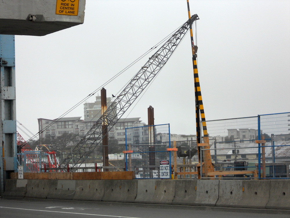 Looking back, a view of our hard-working blue bridge; still in service while its replacement is being built beside it.
