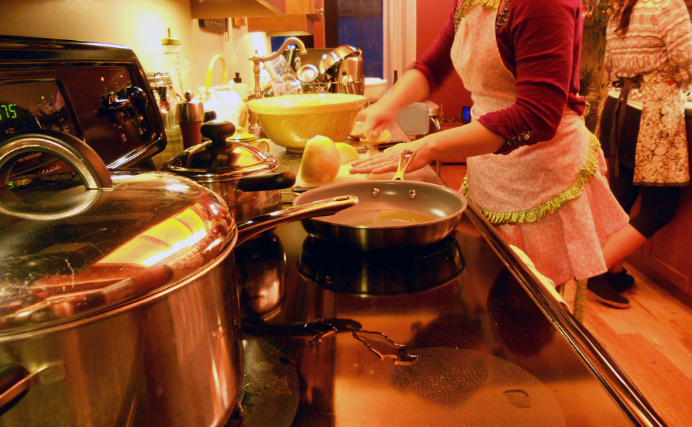 For the last few years, we have hosted a group of friends for Christmas dinner. My favourite part of preparing for these events has been designing a display for the dinner table. We rarely use our large table for dining, as it is also GJ’s workspace, so it takes a special event to clear it off. This year, I chose a snowy woodland theme. I made five little trees with Sculpy low-fire clay, painted them white, and sprinkled the wet paint liberally with fine glitter. These were placed over battery-powered tea lights, and arranged with other candles and various curios we have collected. I cut some holly leaves from wool felt, and needle felted the berries, then combined these with sprigs of cedar to create napkin rings. I also decorated a trunk in the living room with cut glass dishes to hold pre-dinner snacks. The dinner was delicious, as was the table, if I do say so myself!