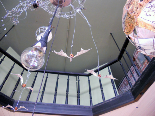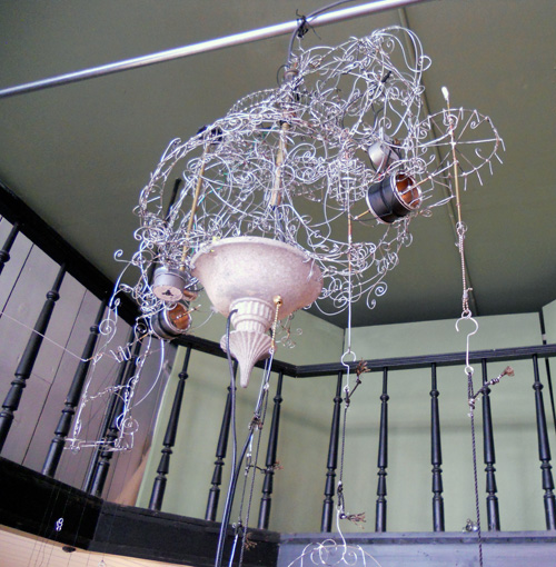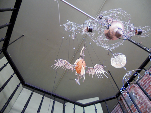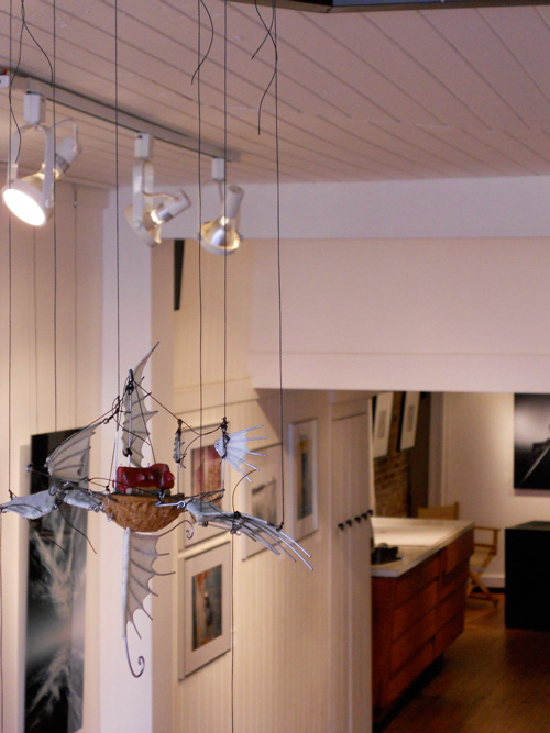 Last week GJ and I set up our new show at Dales Gallery, a block from our studio in Chinatown. The show is mostly of GJ’s kinetic sculptures spanning the last few years of work. He also has some of his sigils and paintings and we made some prints and postcards as well. I had a couple abstract watercolours from 2008 and painted five new ones as well. We also included a few copies of a hand-bound book I made of GJ’s Spirits of the Mechanical Age sculpture series from a few years ago. We had a great day at the opening on Saturday. Lots of visitors seemed delighted in our work, especially in the magical nature of the kinetic pieces. Here are a few pics. Will post more pics of specific pieces and links to new videos throughout the next week.