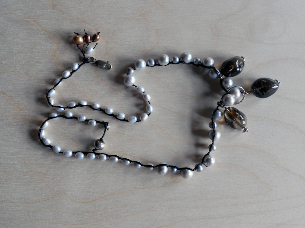 This antique watch chain with medallion and encased coin wanted to be hung as a necklace. I added a smokey-blue length of suede into which I sewed tiny seed pearls. I also added a grouping of pearls to the chain. This piece was commissioned as a gift and the recipient was very pleased. © Firehorse Designs