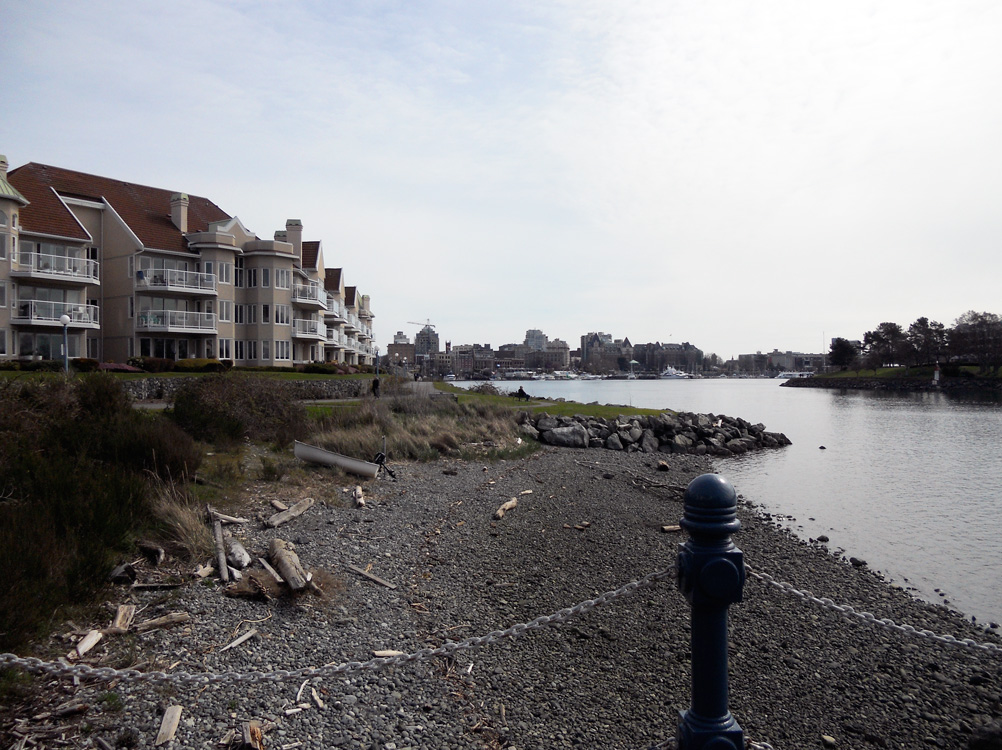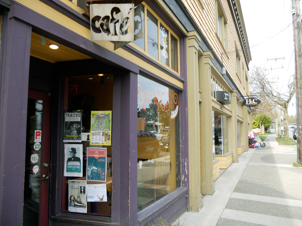 We enjoyed a pleasant spring day walk yesterday along the Galloping Goose Trail and through Banfield Park to Craigflower Road. There is a small bank of shops at the corner of Raynor which includes an old-fashioned barber shop, bakery, children’s clothing shop, hair dresser, hemp clothing store and cafe. Our main destination was The Spiral Cafe to see paintings by Philip Willey. The Spiral hosts a lot of live music and makes great coffee. We also picked up some yummy bread and other treats at Fry’s Red Wheat Bread. The frangipani in their almond croissant was amazing.