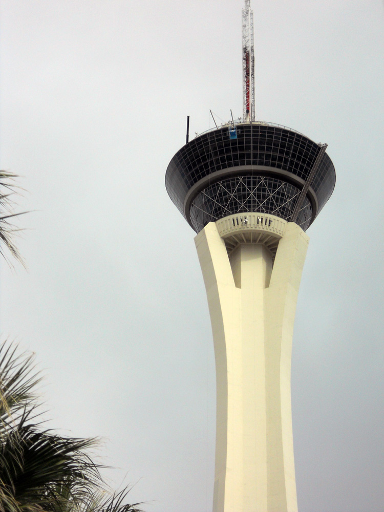 Stratosphere was at the opposite end of the Strip. There is a roller coaster along the top edge that circles the building.