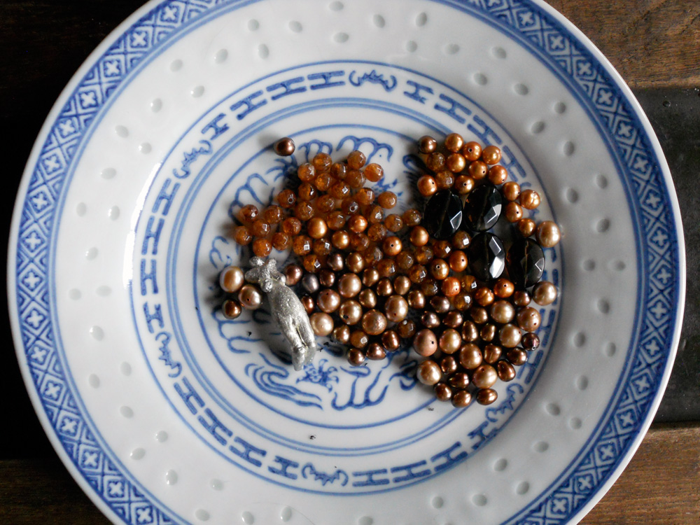 The design is approved, and now I have all the materials in front of me. Wedding jewellery commission for a friend in pearls of cream, light grey, and rich purple-grey. More on this one later…