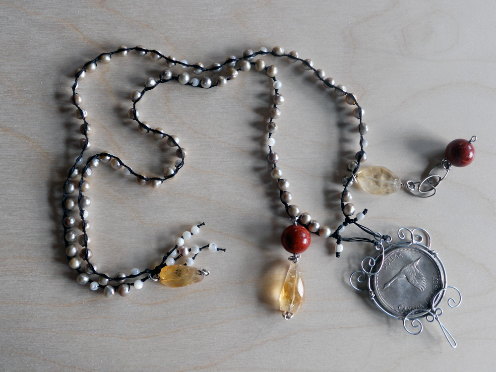 I’ve been working on a few new pieces lately. This one took forever, and I’m very happy with it. The glass and brass pieces are probably from a bracelet. I found them in a random bag of bits and pieces, mostly broken, I bought at the flea market a few years ago. The rest is new – freshwater pearls, amethyst, and smokey quartz with a brass clasp.