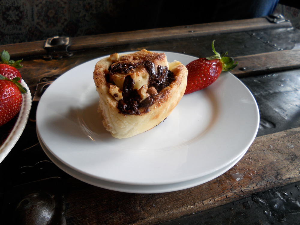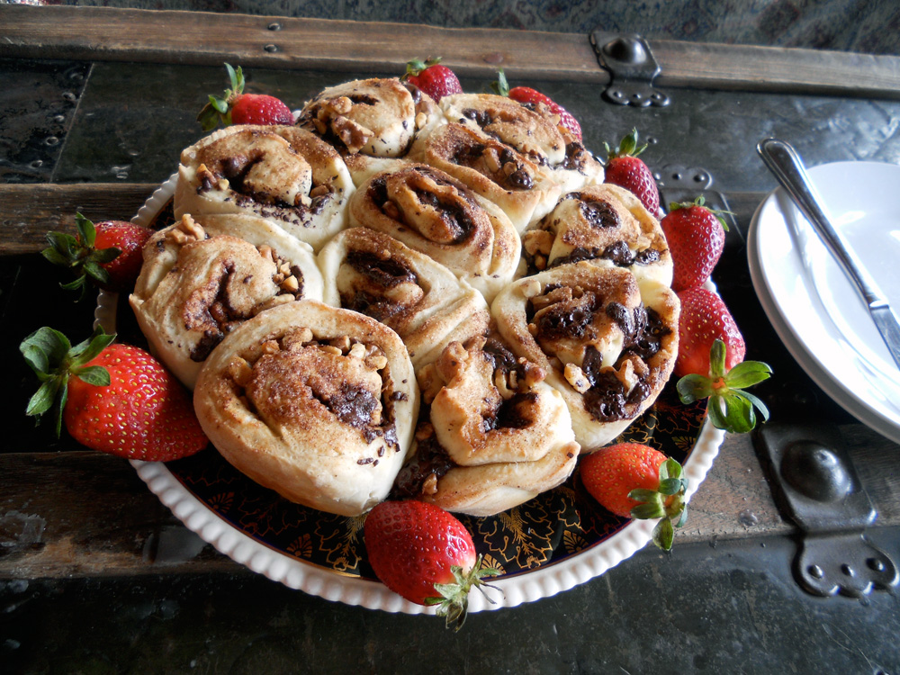 Valentine’s Eve breakfast this morning: homemade chocolate walnut sticky buns with cinnamon. I used this recipe for naan bread. I rolled out the dough after it had risen for about 2 hours, brushed it with melted butter, sprinkled with cinnamon sugar, toasted organic walnuts and chopped organic chocolate. After rolling it up like a jelly roll, I cut into 11 pieces and placed cut side down in a nine-inch round cake pan lined with parchment. The tops were brushed with butter and sprinkled with more cinnamon sugar. Very delicious and not too sweet!