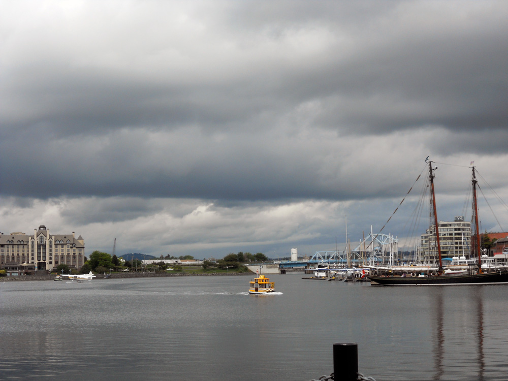 Looking north at stormy sky, with Ocean Point Resort, float plane leaving, harbour ferry, our infamous blue bridge and a gorgeous SALTS ship in view.